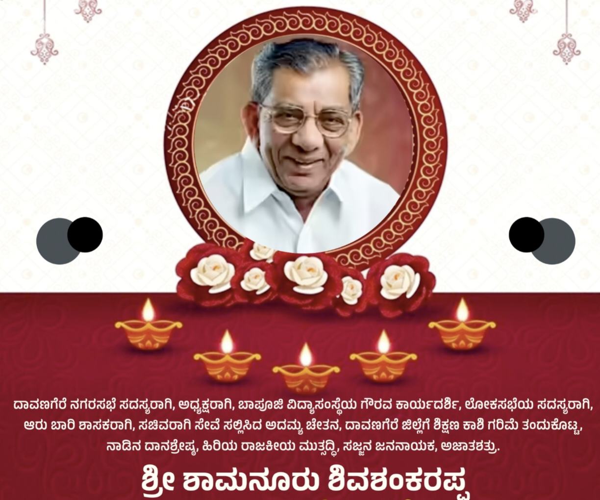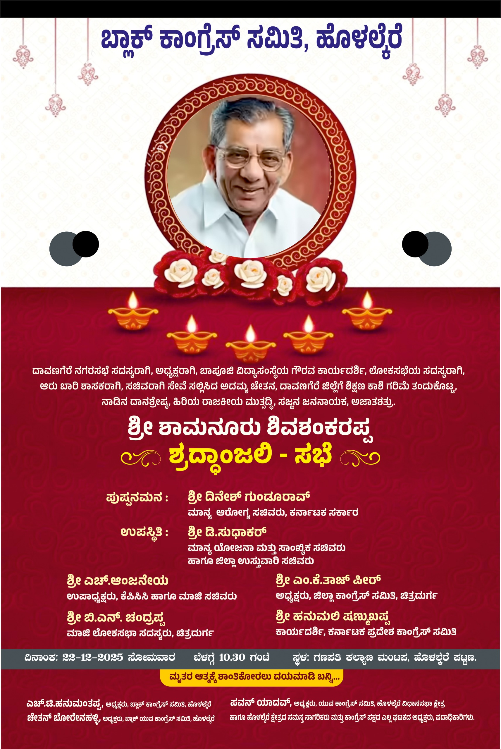 ದಾವಣಗೆರೆ ನಗರಸಭೆ ಸದಸ್ಯರು, ಅಧ್ಯಕ್ಷರು, ಬಾಪೂಜಿ ವಿದ್ಯಾಸಂಸ್ಥೆಯ ಗೌರವಾಧ್ಯಕ್ಷರು, ಲೋಕಸಭೆಯ ಸದಸ್ಯರು, ಆರು ಬಾರಿ ಶಾಸಕರು, ಸಚಿವರಾಗಿ ಸೇವೆ ಸಲ್ಲಿಸಿದ ಅದಮ್ಯ ಚೇತನ, ದಾವಣಗೆರೆ ಜಿಲ್ಲೆಗೆ ಶಿಕ್ಷಣ ಕಾಶಿ ಗರಿಮೆ ತಂದುಕೊಟ್ಟ, ನಾಡಿನ ದಾನಶ್ರೇಷ್ಠ ಶಾಮನೂರು ಶಿವಶಂಕರಪ್ಪ ಅವರಿಗೆ ಶ್ರದ್ಧಾಂಜಲಿ ಸಲ್ಲಿಸುವ ಈ ಸಭೆಗೆ ಸಾರ್ವಜನಿಕರು, ಪಕ್ಷದ ಕಾರ್ಯಕರ್ತರು ಹೆಚ್ಚಿನ ಸಂಖ್ಯೆಯಲ್ಲಿ ಪಾಲ್ಗೊಳ್ಳುವಂತೆ ಹೊಳಲ್ಕೆರೆ ಬ್ಲಾಕ್ ಕಾಂಗ್ರೆಸ್ ಅಧ್ಯಕ್ಷ ಎಚ್.ಟಿ.ಹನುಮಂತಪ್ಪ ಕೋರಿದ್ದಾರೆ.