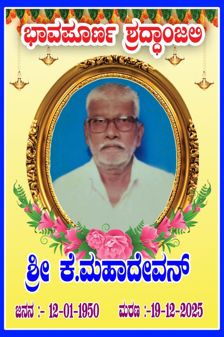 ನೇತ್ರತಜ್ಞ, ಮಾಜಿ ಶಾಸಕ ಡಾ. ಬಿ.ಎಂ. ತಿಪ್ಪೇಸ್ವಾಮಿ ಅವರ ಪತ್ನಿಯ ಸಹೋದರ.ಕೆ.ಮಹಾದೇವನ್ ಇವರು, ದಿನಾಂಕ 19.12.2025ರ ಶುಕ್ರವಾರ ರಾತ್ರಿ 7.30ಕ್ಕೆ ನಿಧನರಾದರೆಂದು ತಿಳಿಸಲು ವಿಷಾದಿಸುತ್ತೇವೆ.